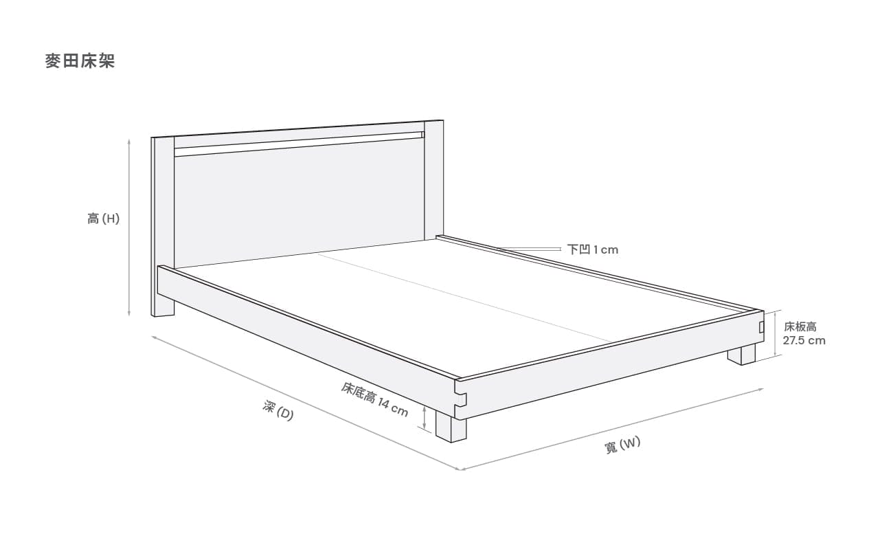 床底高 14 cm,床板高 27.5 cm,床板下凹 1 cm