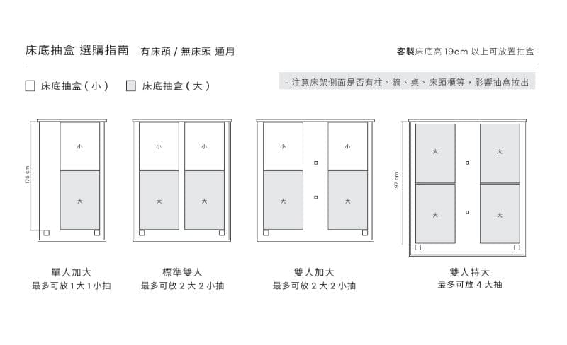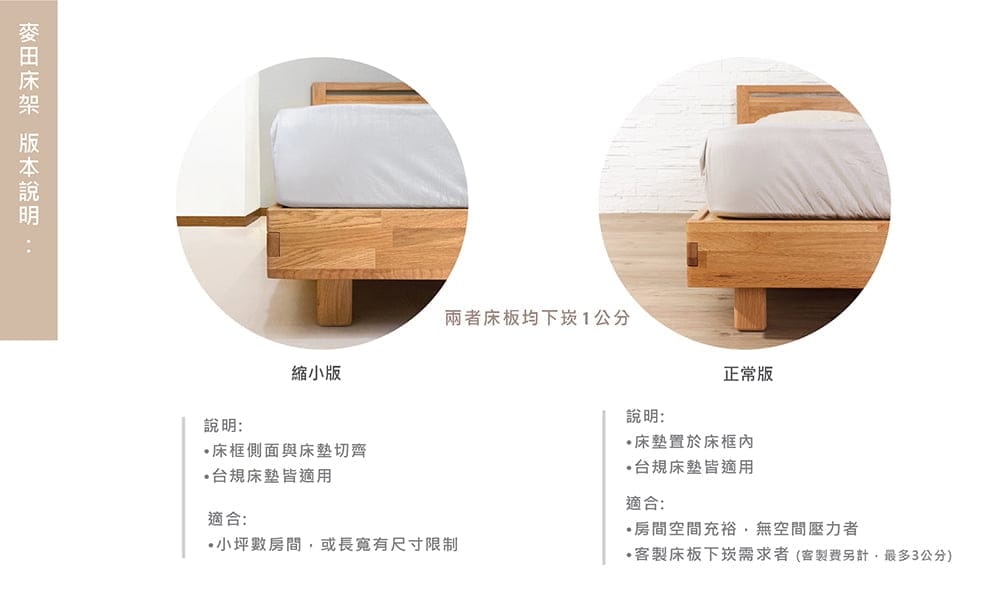 *床架客製床底加高(放置床底抽盒需求者)或其他訂製需求,請點選➤床架加工。